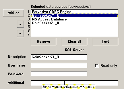 For help on the syntax needed to specify the name of the database server or database, point your mouse at the Additional box. In most cases, this will display a ToolTip message indicating the necessary syntax.