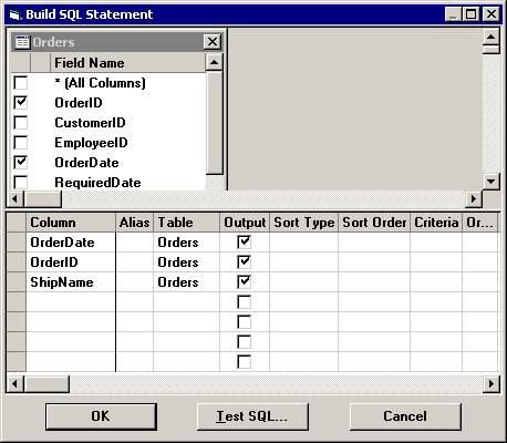If you have already entered information in the SQL Statement box, the Wizard will attempt to pre-fill the SQL Statement Design screen with this information.