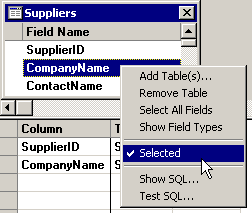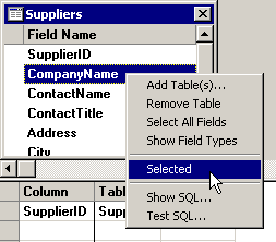 In the Field Name list in the top half of the screen, right-click the field you want to add to the SQL Statement. Then click Selected on the right-click menu.