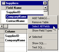To add all fields in this table to the SQL statement, right-click anywhere on the table and then click Select All Fields on the right-click menu.