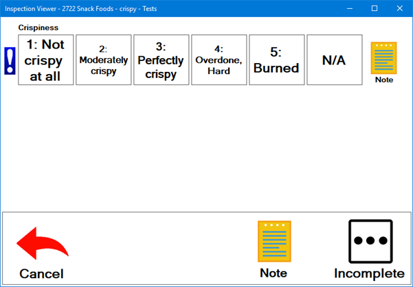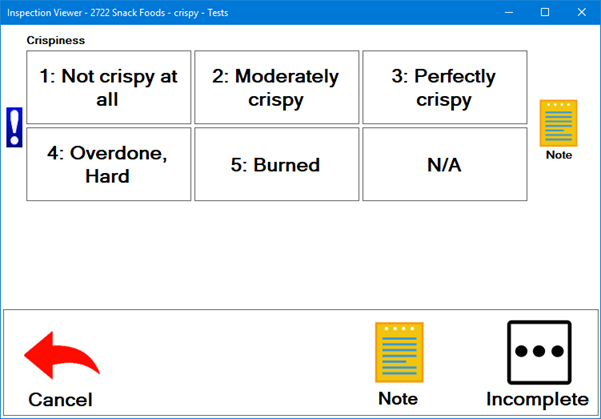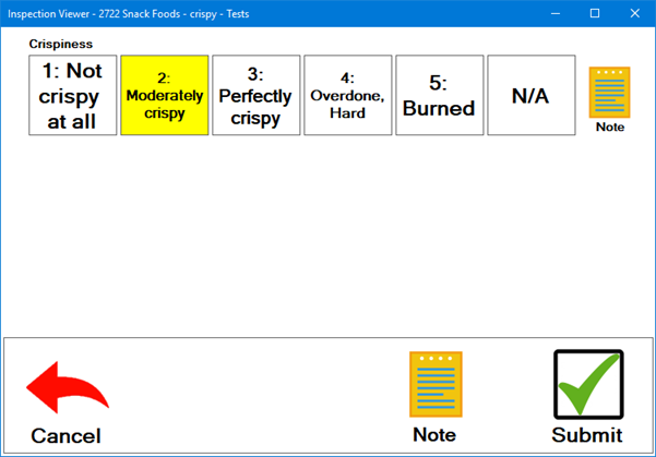 The inspector clicks one of the buttons for each Rating test. Some Rating tests may also display a N/A (Not Applicable) button, which the inspector can click when the test criteria does not apply to an inspected item. For example, a rating test for saltiness may not apply to an item that is being inspected, but that question may be relative to a similar item that uses the same inspection.