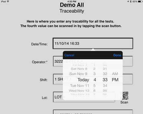 A Date/Time test allows the operator select a date and time under which the inspection data is stored. According to how the inspection was designed, the inspector taps the value field to: