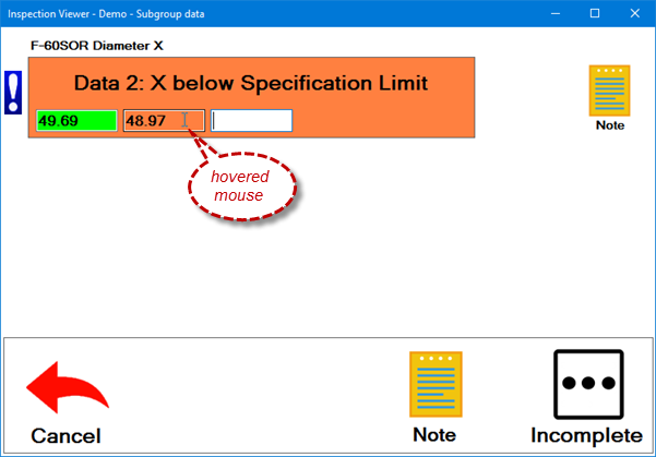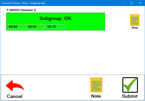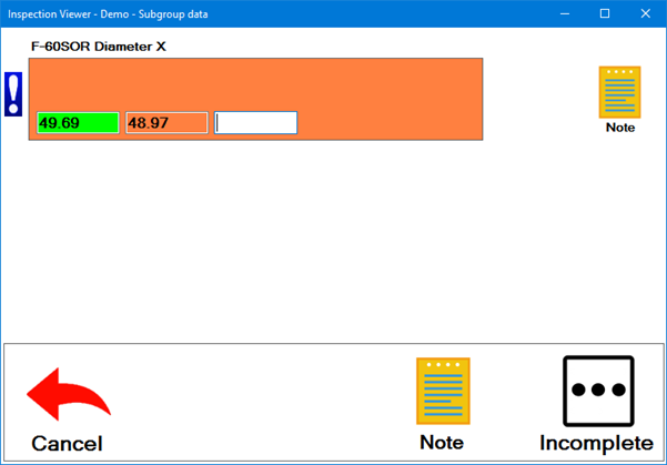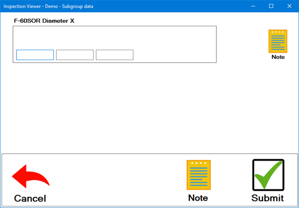 The inspector enters measurement values for the specified SPC standard (F-60SOR Diameter X). The inspector can move between the measurement fields by clicking in them or by pressing the TAB key or Enter key.