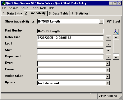 When you enter traceability values on the Traceability tab, every data subgroup will be stored with those traceability values until you click the Traceability tab again to change the values or until you close the Quick Start data entry session.