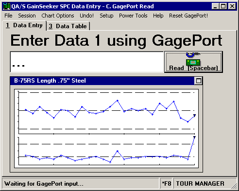 If you use this data entry session to enter data for multiple standards, such as multiple characteristics of one part number, then you must press CTRL+K when the data entry session reaches a new standard. You will recognize when the data entry session reaches a new standard by the data input prompt at the top of the screen (Enter Data 1 using GagePort) and by the status bar text at the lower left corner of the screen (Waiting for GagePort input...).