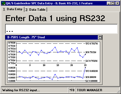 If you use this data entry session to enter data for multiple standards, such as multiple characteristics of one part number, then you must press CTRL+K when the data entry session reaches a new standard. You will recognize when the data entry session reaches a new standard by the data input prompt at the top of the screen (Enter Data 1 using RS232) and by the status bar text at the lower left corner of the screen (Waiting for RS232 input...).