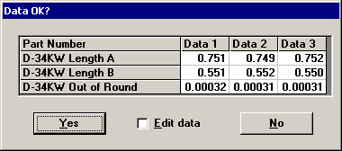 If you want to perform real-time checks and revise the failure note when you change the data before saving it, click No on this Data OK? screen and return to the data entry screen to re-enter your data. You should also click No if you want to re-read values from an electronic gaging device or if the data entry session calculates the data values based on the numbers you enter. |