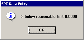 First, the program checks this value against the reasonable limits you have set in the standard. If the data value entered falls outside the reasonable limits, the data entry program will warn you that the value is outside one of the limits, as in the example below: