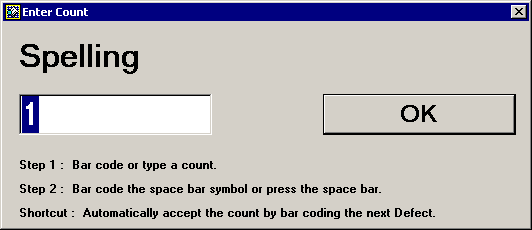 The Enter Count screen will be updated each time a new type of defect is entered, and the defect count on this screen will be set to 1 each time another defect bar code is scanned.