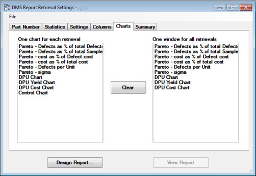 Use the Charts tab on the DMS Report Retrieval Settings dialog box in Dynamic Reports to choose which types of charts to generate for the report.