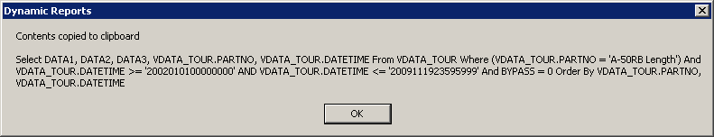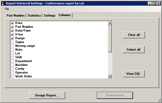 To preview the SQL query that will be used to retrieve data for the selected columns, click View SQL. This will display the query and copy it to the clipboard. Some of the retrieval options from the Settings tab for an SPC report or the Settings tab for a DMS report will also be reflected in this query.