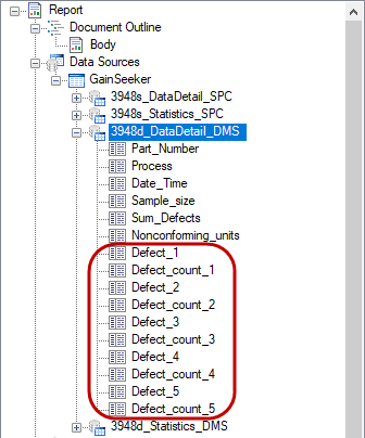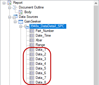 By default, a retrieval will provide up to eight SPC Data columns (per data record) or up to five DMS Defect columns (per data record) to the report Design, like these examples: