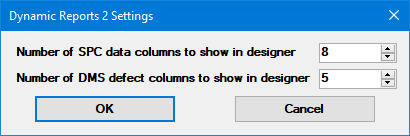 The Settings for the Dynamic Reports 2 determine how many data fields are made available to the report Design when the report's retrieval settings include Columns for Data (for an SPC retrieval) or Defects (for a DMS retrieval).