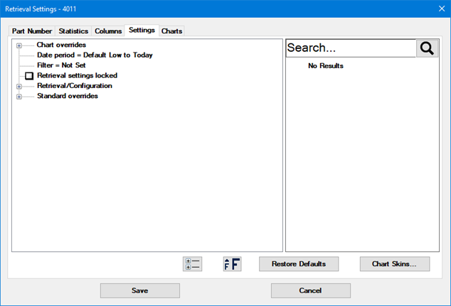 To apply different charting, retrieval or statistical settings for this retrieval, use the Settings tab. The options listed on this tab are the same ones available for DMS charts in the GainSeeker Charts module. For more information, see DMS chart settings.