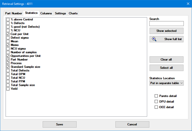 When you are setting up a DMS retrieval, the Statistics tab provides you with additional options: Pareto detail, DPU detail, and OEE detail.