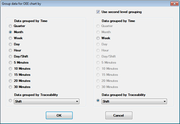 The Group data for OEE chart by dialog lets you group data by a specific time period or traceability item you select for OEE charts. You can also select second-level grouping to display data grouped by both as bar plots on a single chart. The Group data for OEE chart by dialog used to select these options, opens from the Group data for OEE chart by settings.