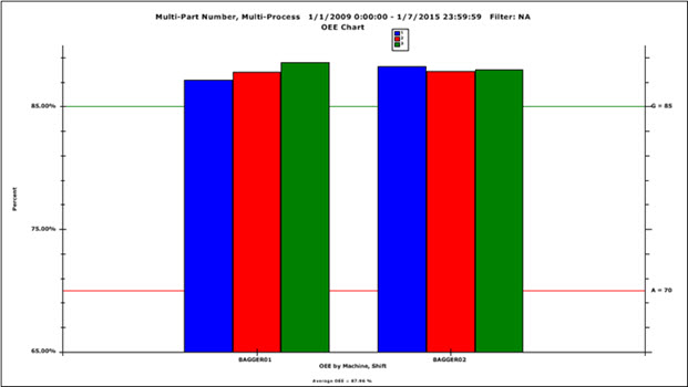by two traceabilities (Machine and Shift, for example). This example displays bars grouped by machine with individual bars with unique colors to represent each shift (Fig. 2). A color legend also displays on the chart.