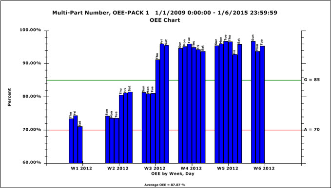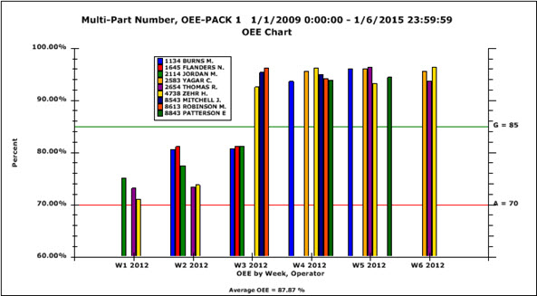 or a combination of a time period and a traceability (week and operator, for example). This example displays bars grouped by week with individual bars featuring unique colors to represent each operator (Fig. 3). A color legend also displays on the chart. Note the spaces in this example within a week. This indicates that there no data for some specific operators during that particular week.