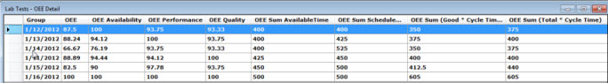 An OEE (Overall Equipment Effectiveness) Detail table lets you view supporting chart data as numerical values in a table format. It displays the values of all calculated OEE statistics for the selected time period.
