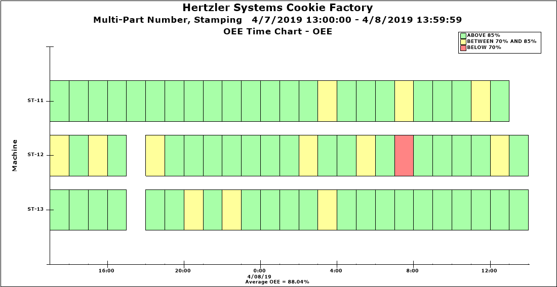 This OEE time chart displays OEE calculated hourly, for three machines:
