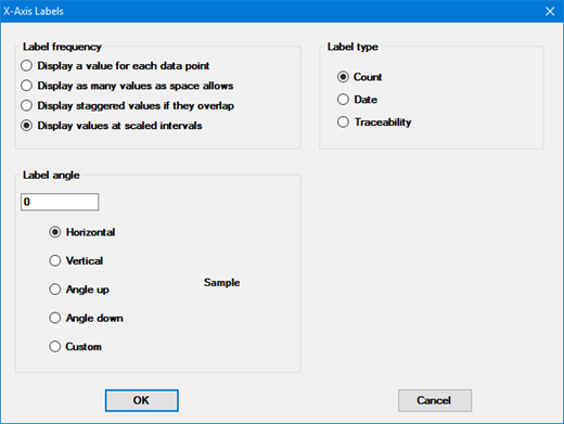 This window changes the SPC Settings or DMS Settings for Chart overrides | Labels and Titles | X-axis labels for control charts.
