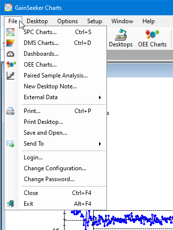 This topic details the File menu options that may be available on the GainSeeker Charts window depending on what you have displayed in the window.