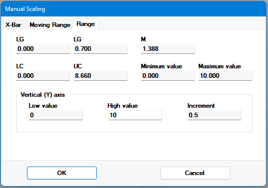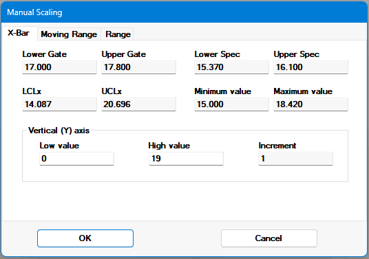 The X-bar, Moving Range, and Range elements of control charts can be manually scaled. Depending on the type of control chart, some of these options may not be available.