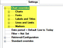All settings in the Chart overrides node on the Settings tab of the SPC Charts window or the DMS Charts window are saved with a chart skin you create. You can change as few or as many Chart overrides settings as you want. Here are a few of the multiple settings you can change: