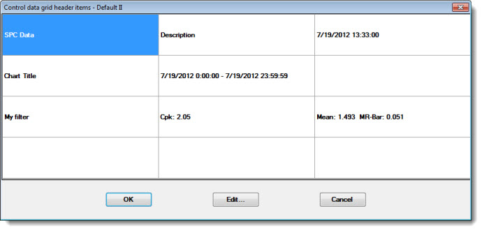 The Control data grid header items option on the Settings tab lets you temporarily override default information to display on an optional grid above an SPC or DMS chart. The data grid header can display summary statistics for the chart, such as mean, and other information such as the date range for the retrieval.