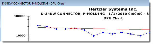 Select this setting to display defect levels of your processes over time against an improvement (goal) line you specify with a starting date and starting value. A 10x improvement line represents a goal of reducing defects by 10 times over two years and 100 times over four years. The GainSeeker default improvement curve is 10x, a value that can be changed in the GainSeeker Administration module.