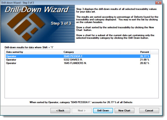 Step 3 displays the drill-down results of all the selected traceability values for your data. These are sorted according to the percentage of defects that were found for the traceability and the category displayed.