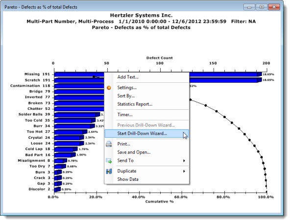 Right-click the Pareto chart , and then click Start Drill-Down wizard... on the menu that displays.