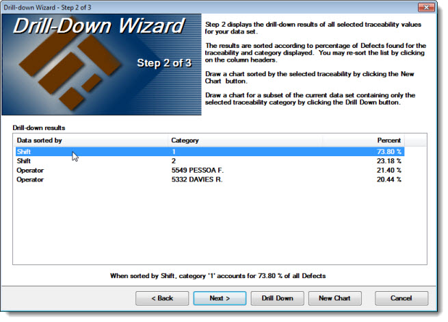 The results are sorted by the highest percentage of defects for each traceability and category. You will usually want to select items with the highest percentage for further analysis. In some cases, the results may be expected, so they can be ignored. An example of this would be when 50% of the results are from Shift 1 and 50% from Shift 2 when you are analyzing only two shifts.