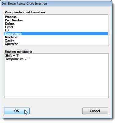 Click Drill Down. The Drill Down Pareto Chart Selection dialog opens.