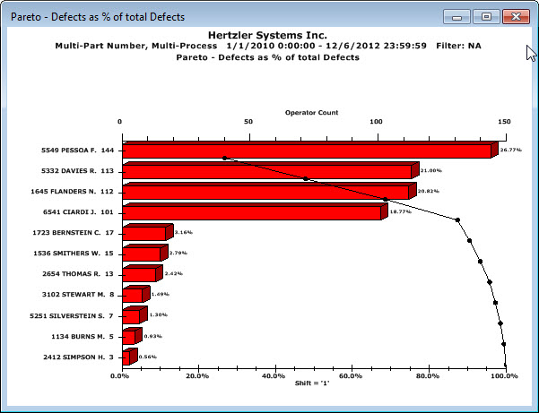 In this example, the percentages for Operator list on Step 3. Operator 5549 Pessoa F. has 26.77% of all the defects in Shift 1.