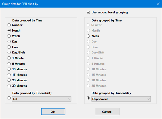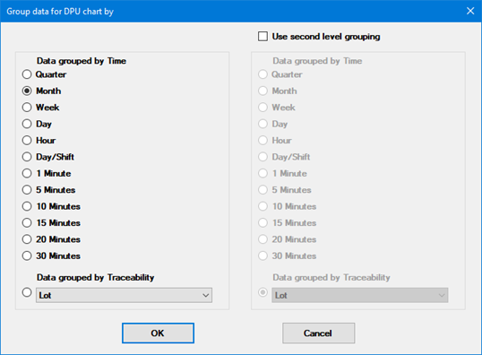 The left-hand panel defines the primary category dividing data records into groups on a DPU chart. You can group data based on dates or times, Day/Shift (separate group for each combination of Day and Shift), or Traceability.