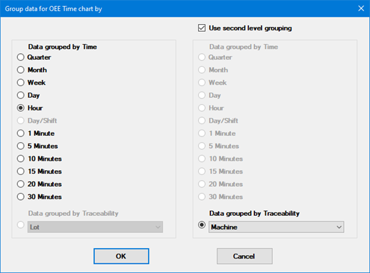For the OEE Time Chart, this setting determines how OEE calculations are separated into date/time increments along the chart's x-axis, and how that data is separated into groups along the y-axis.