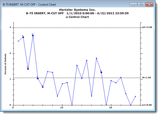 Control Charts and Control Detail tables helps to determine if defects are within the set control limits. Defect data is plotted over time. Following is an example of a u control chart: