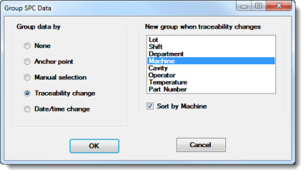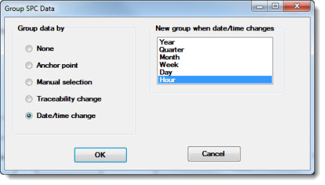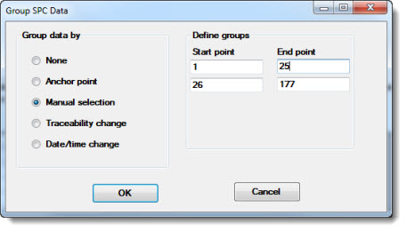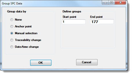 Use the Group SPC Data dialog to set the control limit calculation grouping for most control chart types and for Performance charts.