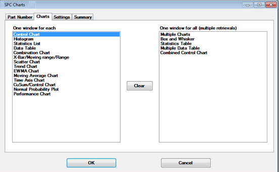 If you select two part numbers on the Part Number tab, and you select Control Chart, you will create two control charts—one for each part number—on separate windows. If you select two part numbers on the Part Number tab, and you select both Control Chart and Histogram from the One window for each list, you will create four charts—a histogram and a control chart for each part number. |