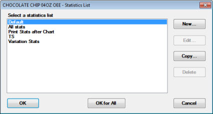 The OK for All button on the Select a statistics list dialog can be used to apply the selected statistics list to all of the part numbers you select for the retrieval.