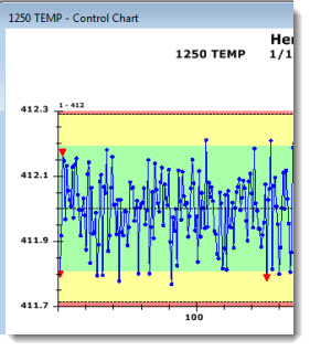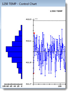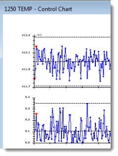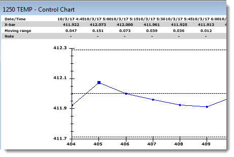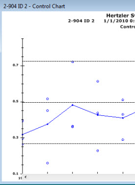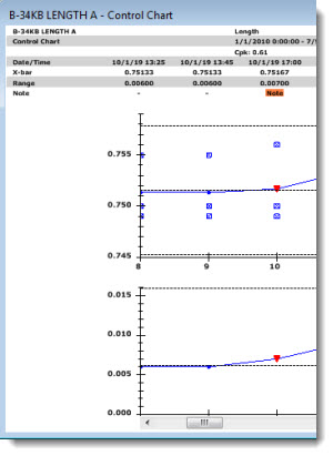 The following chart has been set to display 10 data points at a time (not all are shown in this example) in the charting window as a user scrolls through the data using the scrollbar at chart bottom. An optional Control data scrolling grid with user-selected statistics and traceability items has also been added above this chart.