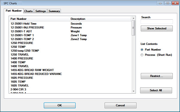 Use the SPC Charts dialog to select part numbers or short-run processes and configure multiple possible settings for SPC retrieval charts.