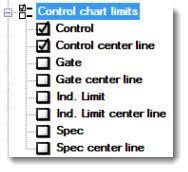 Use the Limits to Display options under the Lines and Limits node on the Settings tab tree to set the limits to display for an SPC chart.