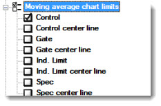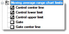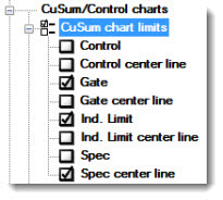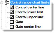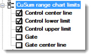 Displays these limits on a CuSum/Control X-bar chart. Click an option to select or to clear the checkbox. See Chart Limit options for descriptions of each option.