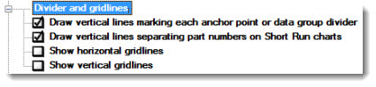 Choose whether to draw vertical dividers to mark anchor points and separate data groups, separate part numbers on short run charts, and display X-axis (vertical) or Y-axis (horizontal) gridlines on a chart.