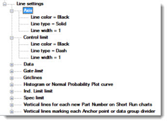 Set the color, line type (solid, dash, and so forth), and the width of various lines on the chart. Expand the Line settings node to display the line type list. Then, expand the line type for which you want to change to display the options. The options for each line type are the same: Line color, Line type, and Line width.