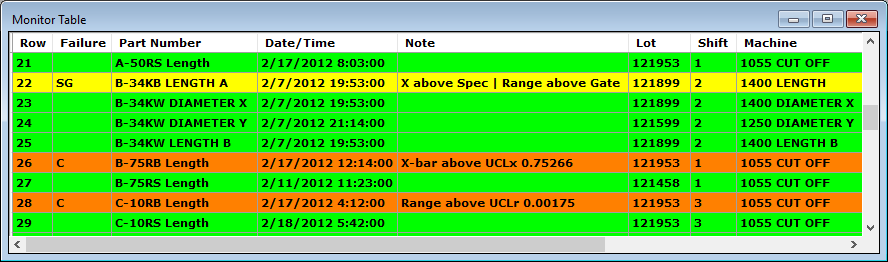 The row colors are defined by the Monitor Table Colors and Priority setting for the configuration. Colors may be defined for types of real-time failures, or for specific values in traceability, Event, Cause, or Action Taken fields.