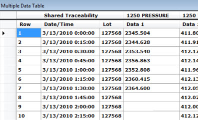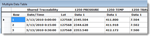The Shared Traceability columns are used to match data records from different retrieval groups that share the traceability information displayed in the table. For example, in the table shown below, each retrieval group has a data record with the date/time stamp close to 3/13/2010 and the Lot number 127568.