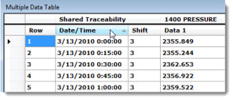 By default, a Multiple Data Table is sorted in ascending order by the first Shared Traceability column. Identical rows within that column are also sorted in ascending order by date/time stamp.